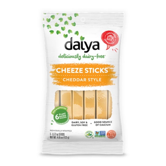 Tasty and smooth. Cheeze Sticks Cheddar Style are delicious dairy-free snacks for work, school, or play. Six individually wrapped vegan cheese sticks that are free from dairy, gluten, soy, and peanuts, making them a tasty and convenient addition to lunch boxes everywhere.